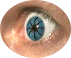 To put that into layperson's language, the qualified eye surgeon would make a series of cuts (usually 4 to 8) in the cornea with a scalpel, in a pattern that resembles a spoked wheel (pink lines in photo right). These cuts are fairly deep, sometimes to 90% of the thickness of the cornea. As you can see from the diagram below, these "V" cuts cause the central cornea to relax or flatten and the peripheral cornea to steepen, reducing the dome of the central cornea with a resulting improvement in uncorrected vision.